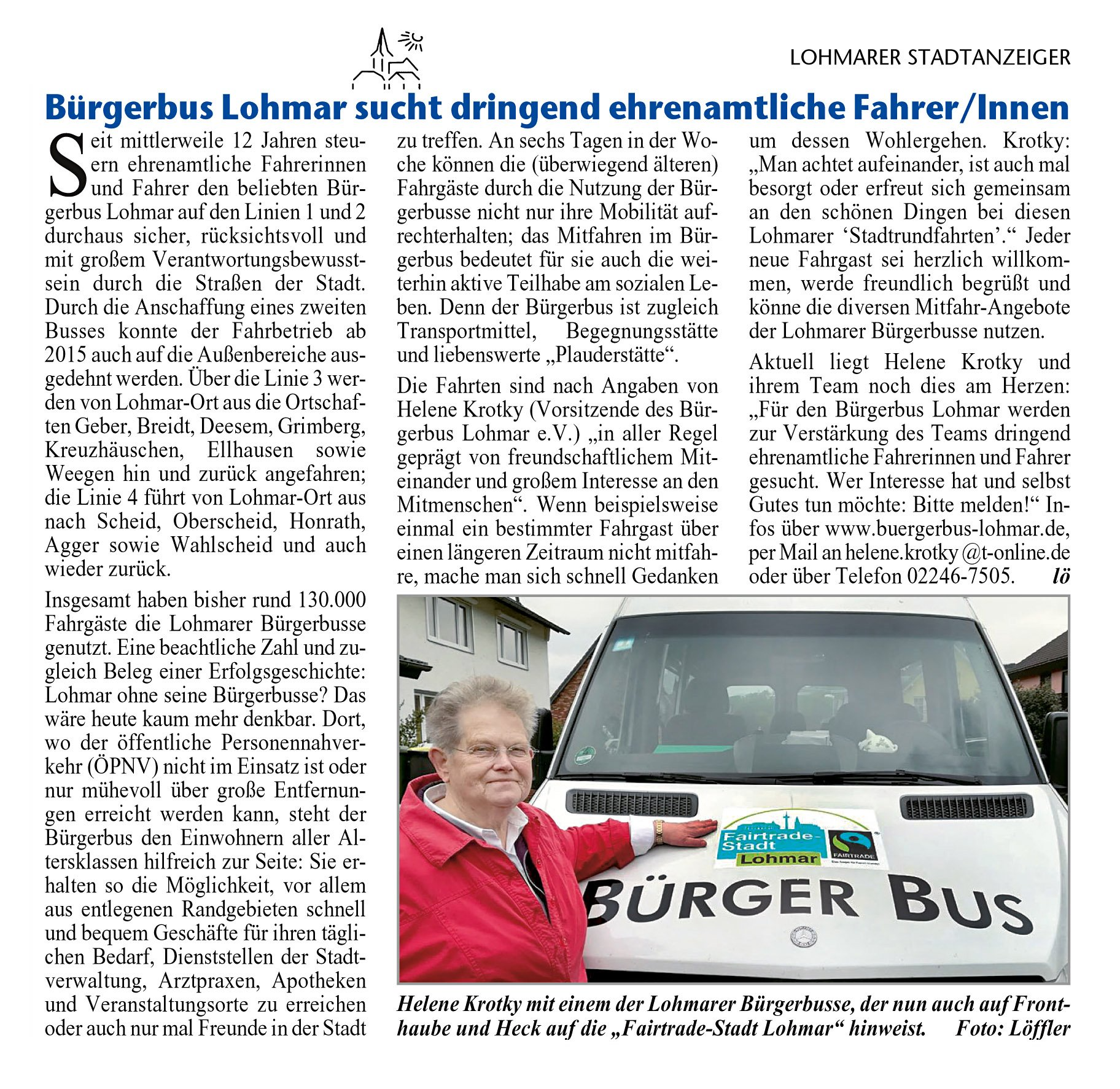 „Seit dem ersten Bürgerbuseinsatz in Lohmar sind die Stadtverwaltung und die Stadtwerke unsere zuverlässigen Partner“, so die Vorsitzende des Bügerbus-Vereins Helene Krotky. „Wir sind dankbar, dass wir uns vom Gründungstag an immer auf die treue Unterstützung der Stadt und der Stadtwerke verlassen können. Auch die Gestaltung des neuen Fahrzeugs spiegelt ein Stück Lohmar wieder und macht uns stolz: Natur pur, Lohmar – das Städtchen im Grünen auf der Seite der Stadtwerke und auf der Seite der Stadt: die Silhouette von Lohmar bestückt mit Symbolen, die die neuen Smart-City-Maßnahmen darstellen.