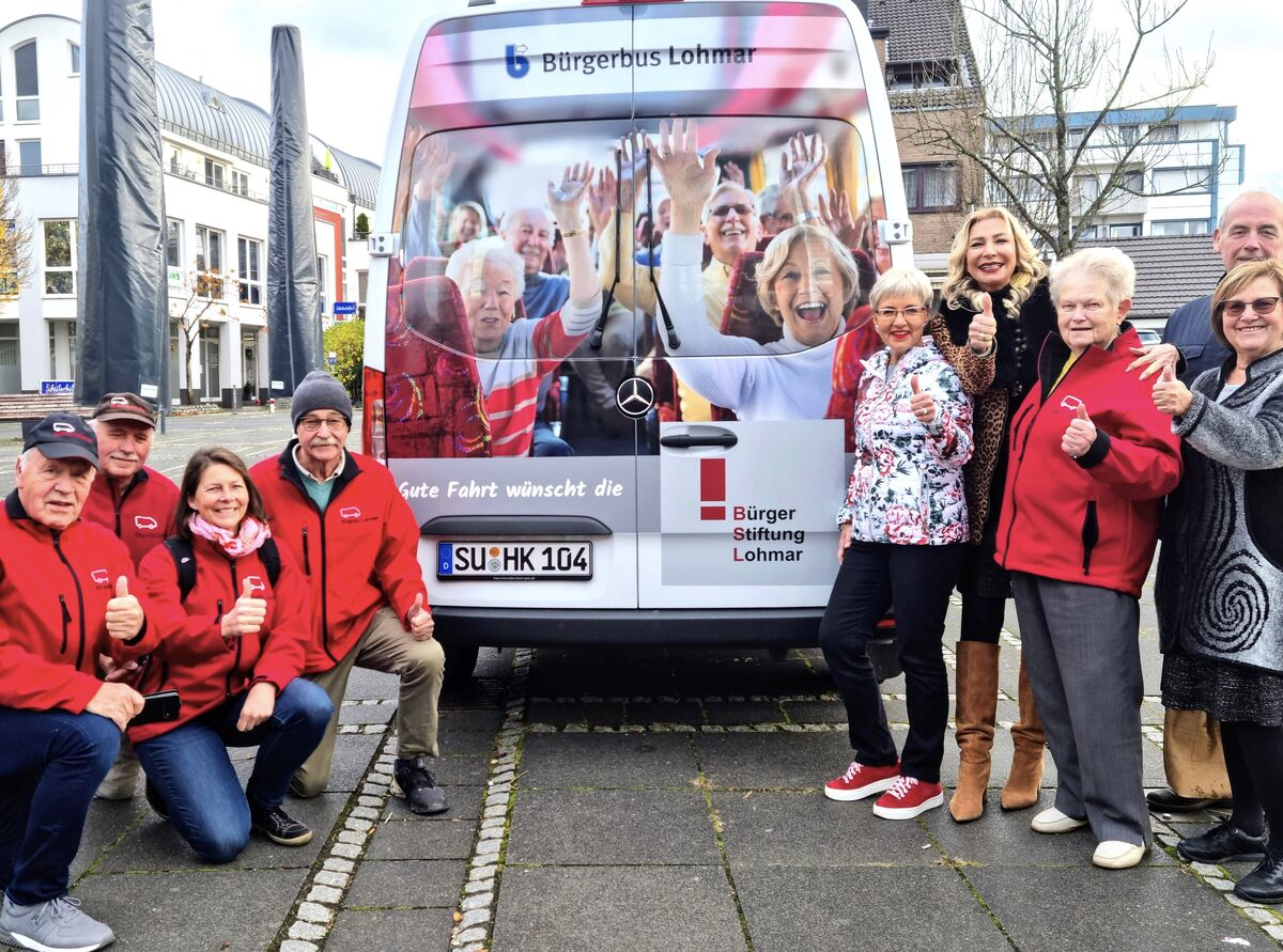 Lohmar. Ob er im Rückspiegel auftaucht oder vor dem Auto im Verkehrsstau steht: Der neue Lohmarer Bürgerbus sorgt bei genervten Autofahrer*innen für ein wenig Gelassenheit und ansteckenden Optimismus. Denn auf dem Heck und auf der Motorhaube wünscht eine fröhlich winkende Gesellschaft im Namen der BürgerStiftungLohmar „Allzeit gute Fahrt“. Der Gruß gilt freilich in erster Linie den Passagieren im Bürgerbus, dessen Ankauf die Stiftung mit rund 15.000 Euro unterstützte. Zwar hat sich das Land NRW mit einem Zuschuss von 35.000 Euro an der Anschaffung des neuen Fahrzeugs beteiligt, doch den Eigenanteil hätte der Bürgerbusverein selbst bezahlen müssen, wäre die Stiftung nicht in die Bresche gesprungen.